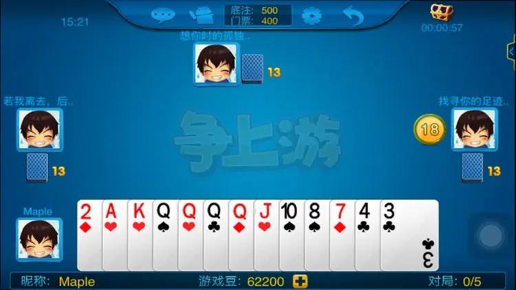 《争上游》是一款源自中国的经典扑克牌游戏,地方名称众多,如“跑得快”、“打升级”,核心玩法却始终如一——率先出完手中的所有牌,即为“上游”。游戏适合3至4人参与,使用一副或两副牌,牌型丰富多变,节奏快速爽快。